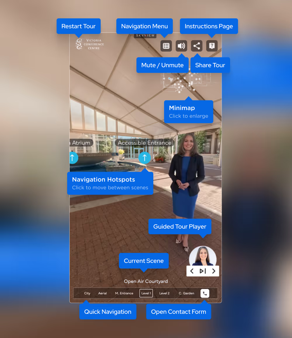 To cater to clients around the globe, 360Pros optimized the virtual tour for both desktop and mobile devices. Users can explore each room’s features, watch embedded videos, and click on interactive icons to reveal critical event-planning details—such as power access, seating arrangements, or technology services offered by the VCC. As the centre continues to evolve, VCC staff can seamlessly update tour content to include new rooms, partnerships, or special offers, ensuring the tool remains current and relevant.